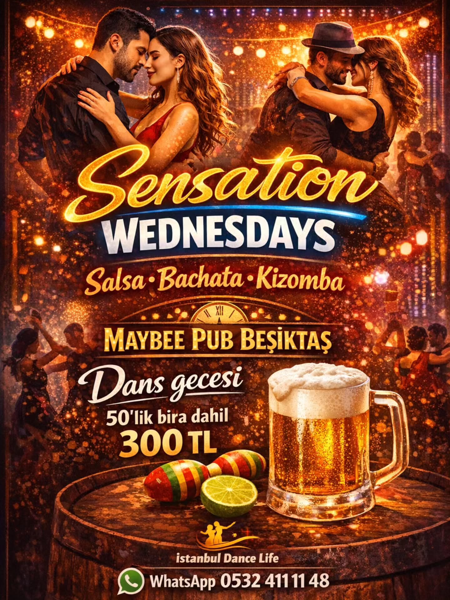 Sensation Wednesdays Latin Party @ Maybee Pub Çarşamba 21.30-01.30 Çarşamba akşamı Salsa – Bachata – Kizomba dolu harika bir gece için seni Maybee Pub Beşiktaş’a bekliyoruz! Ritmi hisset, dans et, eğlen! 💃🕺 ⏰ Party: 21.30 – 01.30 🍻 50’lik bira + dans partisi: 300 TL 📍 Maybee Pub Beşiktaş Barbaros Bulvarı No:61A (Conrad Otel’in tam karşısı – cadde üzeri) 📲 WhatsApp: +90 532 411 11 48 #latinnight #dancenight #salsa #bachata #kizomba latingecesi besiktaslatingecesi latinnightistanbul istanbuldancelife maybeepub